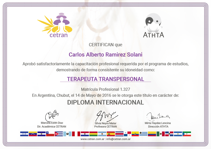 El Centro de Estudios Transvivenciales CETRAN y La Asociación de Terapeutas Hispanoamericanos Transpersonales y Alternativos ATHTA en reconocimiento a tu idoneidad para el ejercicio de la profesión se complace en distinguirte con un DIPLOMA de validez INTERNACIONAL